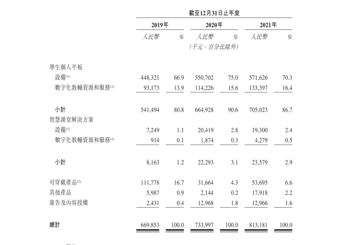 2019-2021年,智慧课堂解决方案总设备出货量分别为7100台、21300台和19900台,已分别向65所、50所和113所学校提供智慧课堂解决方案,每台零售价在1998元至4898元之间。可穿戴产品,即智能手表在此期间的总出货量分别为38.09万台、11.22万台和18.85万台,零售价在390元至1000元之间。
