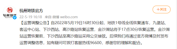 @杭州地铁官方 微博消息,自2022年5月19日16时30分起,地铁1号线全线恢复通车,九堡站、客运中心站、下沙西站、高沙路站恢复运营,金沙湖站将于17点30分恢复运营。金沙湖站运营恢复前,下沙西站至高沙路站采用公交接驳。后续我们将通过官方微博及时发布运营调整信息,如有疑问可拨打客服热线96600,感谢您的理解和配合。