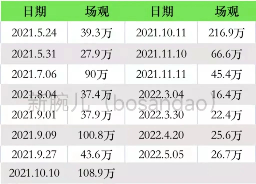 同时,我们依据新腕历史发布的主播榜单记录的刘涛数据补充其首秀后至21年5月的初步数据(由于新腕仅记录全平台top50主播,未达到此标准数据不收录,因此会小于真实情况)。