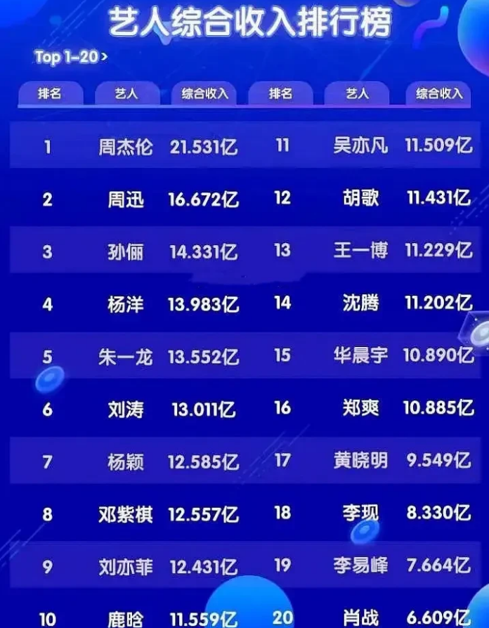 网上公开过一份艺人2017年至2020年四年收入排行榜,排名第一的艺人周杰伦四年收入21.531亿,换算年收入为5.38亿。排名第二的周迅,四年收入16.672亿,年收入为4.168亿。和贾乃亮9个月直播带货收入,持平了。