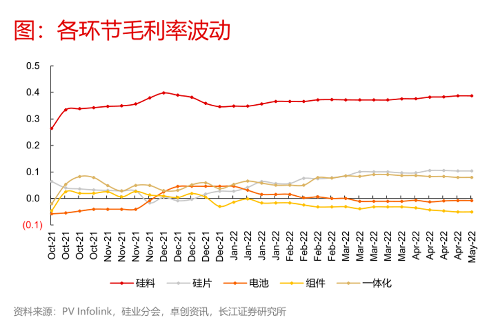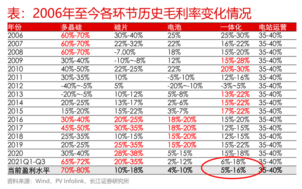 这种状况从长江证券整理的光伏各环节毛利率看得更加清晰。