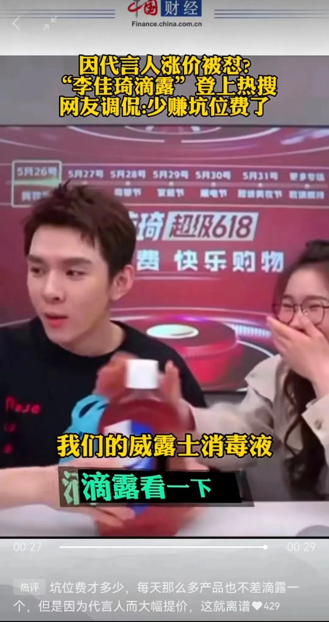 据了解,李佳琦在5月16日预告某品牌的消毒液时喊话滴露:“求求你了,把价格回到以前,不用减钱,我就播了”。