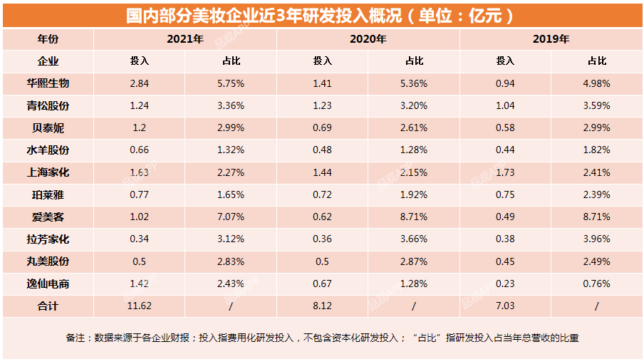 统计可知,2019年-2021年,上述10家美妆企业总研发投入分别为7.03亿、8.12亿和11.62亿。3年共投入26.77亿,累计增长65.29%。其中,2021年增速明显,同比增长43.1%。