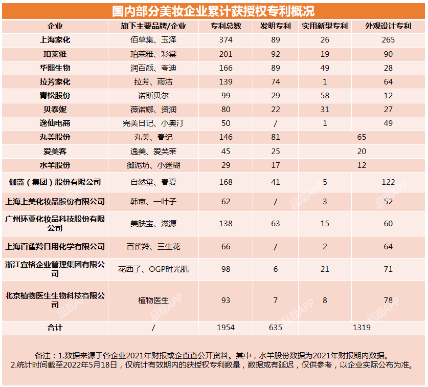从发明专利看,总数为635项,占专利总数32.5%。其中,前三位是珀莱雅、上海家化和华熙生物,发明专利数量分别为92项、89项、89项。