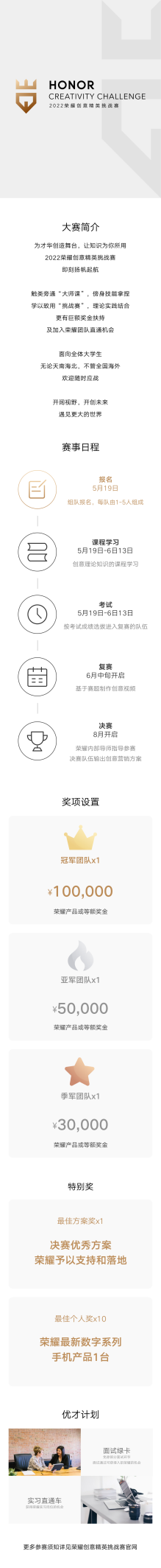 相信通过2022荣耀创意精英挑战赛,会有更多的营销创意方案诞生,会有更多的人才获得成长和就业机会。后疫情时代下的就业“寒冬”,让2022荣耀创意精英挑战赛来融化!