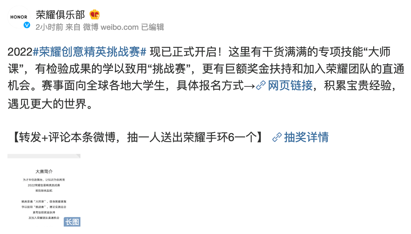 作为荣耀面向高校创意精英的专属赛事,5月19日,2022荣耀创意精英挑战赛正式开启,征召全国及海外大学生前来应战。大赛围绕“遇见更大的世界”主题展开,荣耀资深专家团队出题,邀请全球高校精英们加入,一起探索天马行空的创意与多元丰富的落地思路,挖掘优秀的校园营销、创意人才。