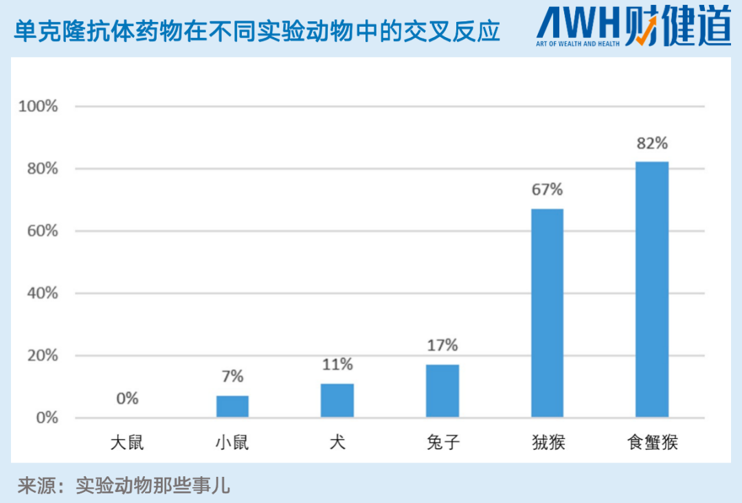 2019年一项针对39个单克隆抗体药物在实验动物中产生交叉反应的实验显示,大鼠完全没有交叉反应,兔子、狗、小鼠的数据都在20%以下,绒猴的交叉反应为67%,食蟹猴的交叉反应是最高的,可达82%。可见,实验猴在生物大分子实验中是不可替代的。
