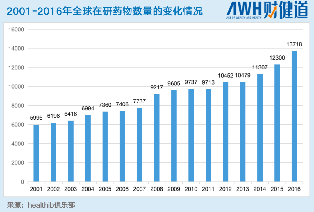 21世纪以来,全球在研新药数量继续保持稳定增长态势,2016全球在研新药数量增幅高达11.5%,远超2015年8.8%的同比增幅。同一时间,国内的新药研发由单纯仿制向专利以及自主创新海外协同发展的新方向出发,人们扎堆进入生物大分子的研发方向,PD-1等抗肿瘤药物如火如荼地推进。