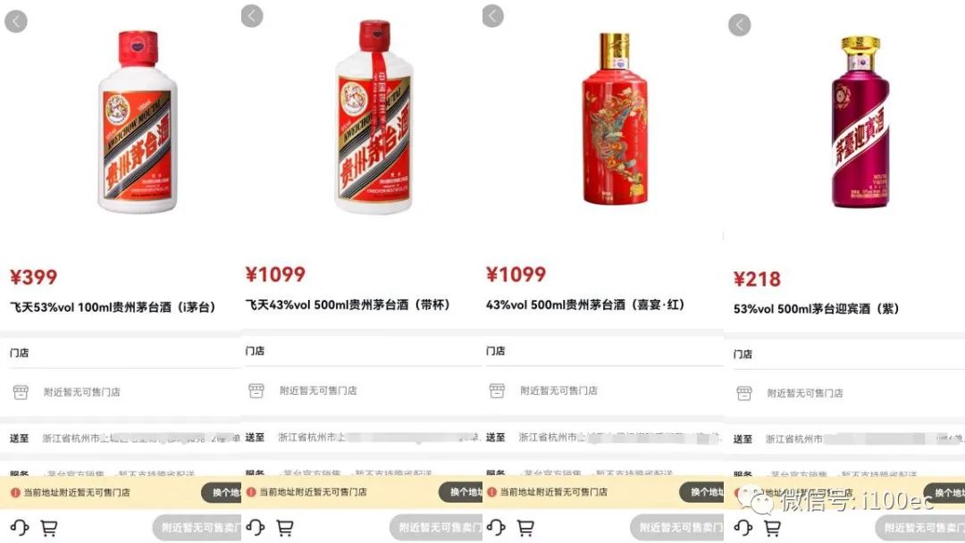 而5月19日上线的云购产品无需申购,填写收货人信息后即可购买。虽然能够直接购买,但是也不容易买到。网经社体验员于今日中午12电商进入云购页面,填写收货地址后,飞天53%vol 100ml贵州茅台酒、飞天43%vol 500ml贵州茅台酒、53%vol茅台迎宾酒(紫)、43%vol 500ml贵州茅台酒(喜宴·红)就已显示“附近暂无可售卖门店”,仅53%vol 500ml茅台王子酒(金王子)有货。