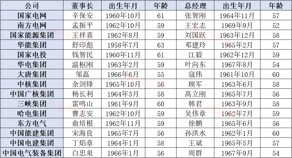 其中,已满60周岁的电力央企一把手有四位,分别为华能集团董事长舒印彪,63周岁;国家电网董事长辛保安,61周岁;国家电投董事长钱智民,61周岁;三峡集团董事长雷鸣山,60周岁。