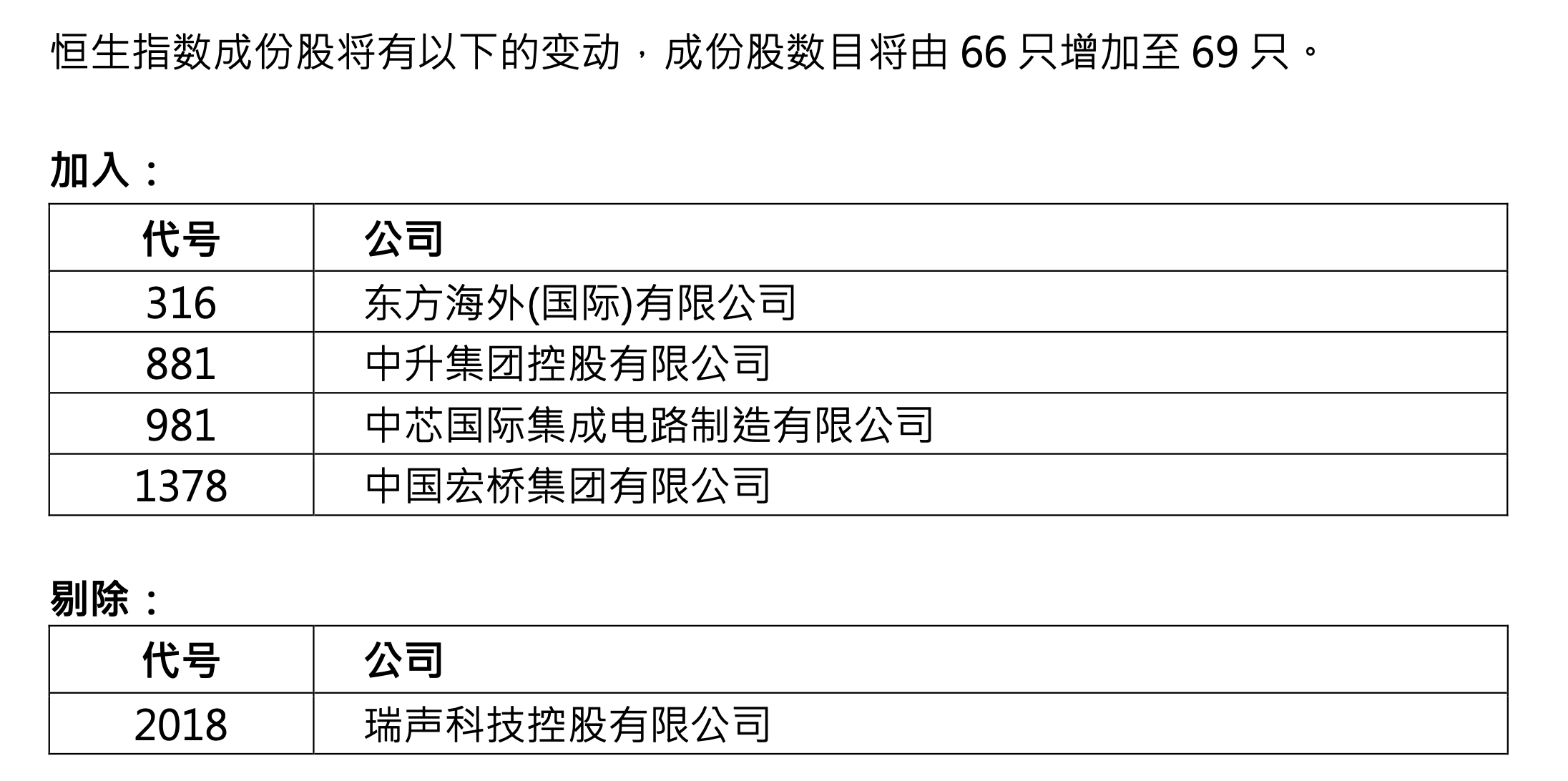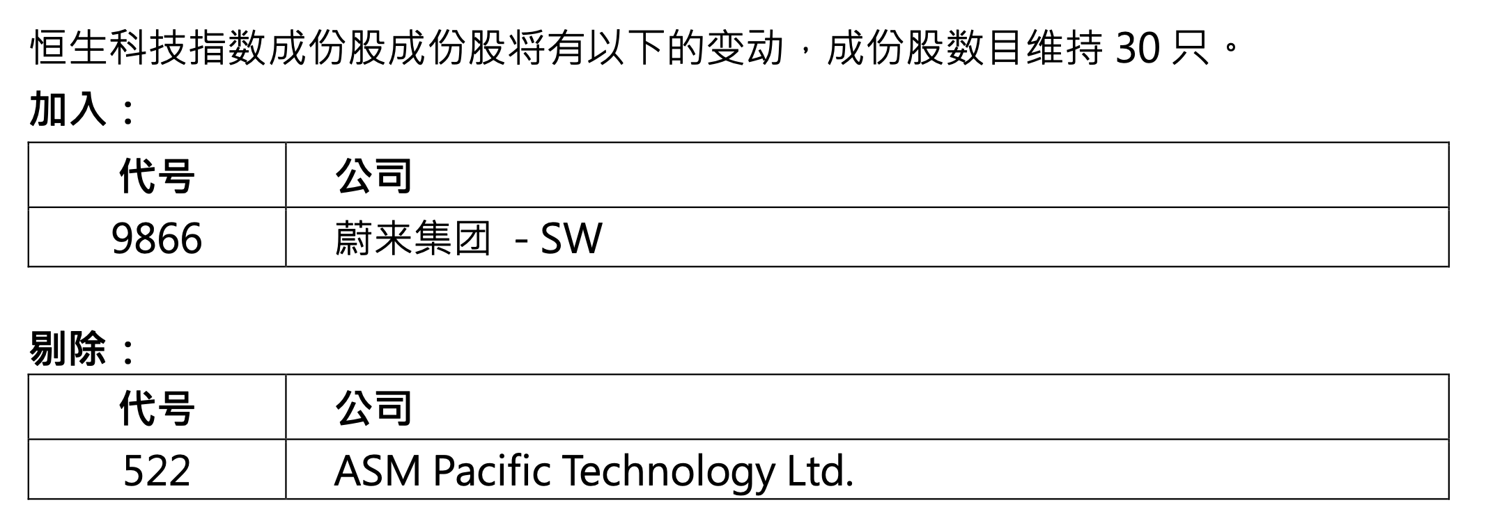 5月20日,恒生指数公司公布季检结果,将中芯国际等4家公司纳入恒生指数,剔除瑞声科技,成份股数目将由66只增加至69只;将蔚来集团纳入恒生科技指数,剔除ASM Pacific Technology,成份股数目维持30只。