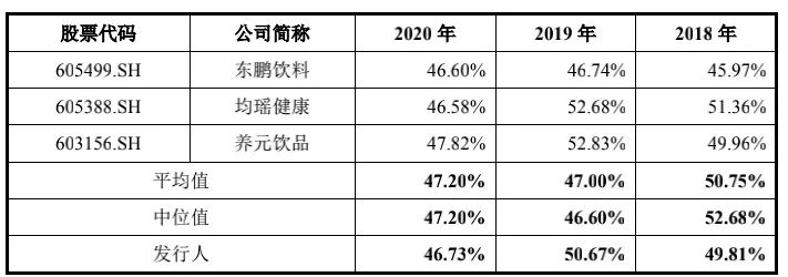 毛利率也十分可观,其中玻璃瓶橙味汽水最高,分别为58.48%、57.17%和57.59%,整体毛利率则为49.81%、50.67%和46.73%,与东鹏饮料(605499.SH)养元饮品(603156.SH)等上市公司相当。
