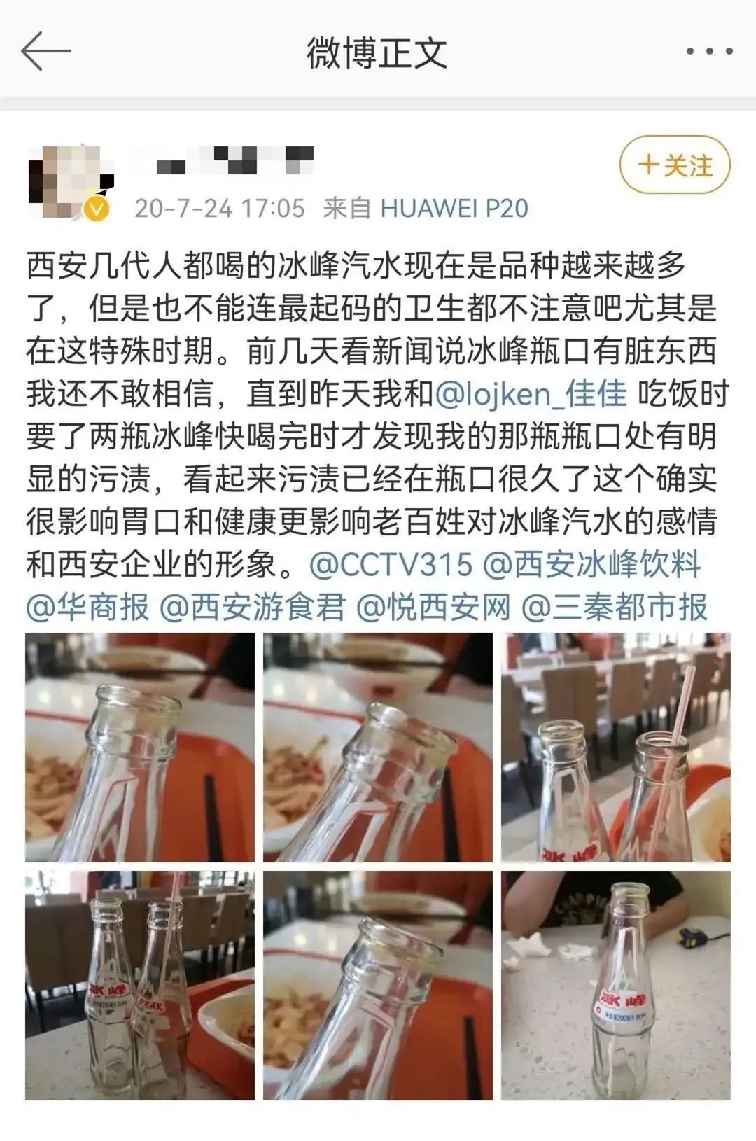 也有人在微博等公众平台上也有人吐槽冰峰瓶装汽水的瓶口有污渍,十分影响胃口和健康。