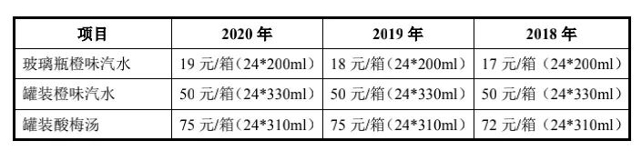 除了玻璃瓶清洁问题和吸管问题外,玻璃瓶橙味汽水还在2020年迎来了一波涨价潮,“原来是两块一瓶,现在是两块五、三块,也就是最近才涨的价。”袁李绮表示。这点在《招股书》也得到印证,数据显示,玻璃瓶橙味汽水的价格正逐年上升,从2018年的17元/箱涨到了2020年的19元/箱。