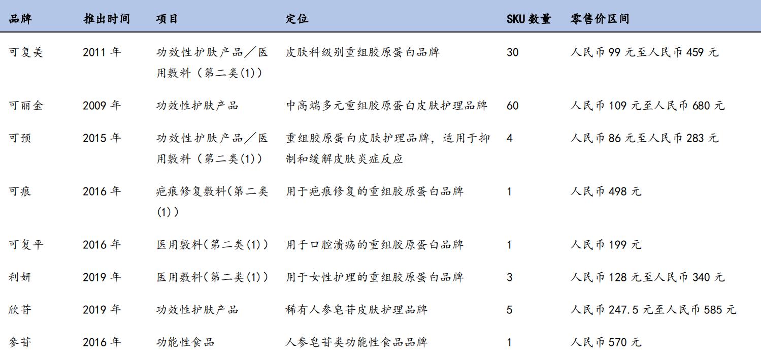 2009年,胶原蛋白美容概念炽手可热,巨子生物凭借自有技术优势,迅速切入该赛道,成为全球首个实现批量生产胶原蛋白护肤品的公司,于同年推出皮肤护理品牌可丽金、可复美。在之后,逐渐建立起多元化的品牌体系及产品矩阵,截至 2021 年底,可复美品牌旗下共有 5 大系列、30 款 SKU 产品,全面覆盖敷料、护肤品类,涵盖了中高端市场。2021年,巨子生物参与起草行业标准及技术要求,奠定了行业龙头地位。
