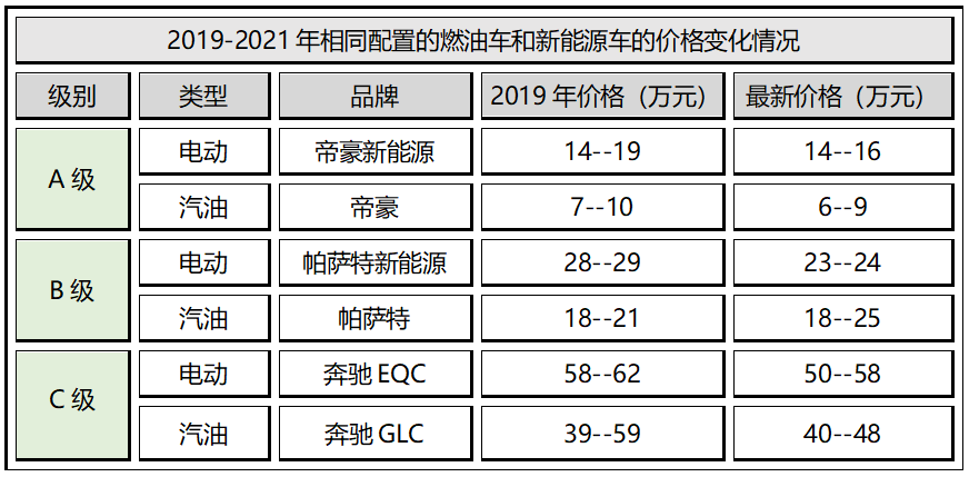 第三,价格因素。通过统计三种级别相同配置的燃油车和新能源车价格变化,可以发现新能源汽车的还有很大的增长空间。