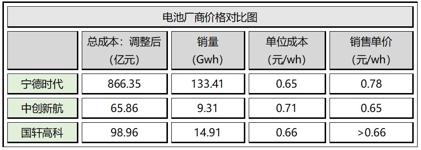 从上述数据中可以发现,宁德时代的销售单价0.78元/wh,单位成本为0.65元/wh,实属正常。但里面有个不合乎逻辑的商业现象,就是中创新航和国轩高科销售单价比单位成本低,通过这种”杀敌八百,自损一千“的方式,来和宁德时代竞争。宁德时代为了保住市场份额,也只能压低市场价格。
