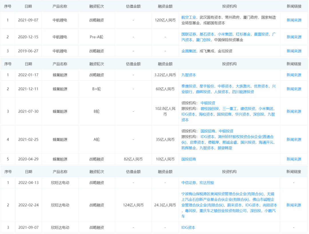 在企查查披露的数据中,中创新航共融资三次,融资金额数百亿元。蜂巢能源也融资多次,融资额达到数百亿元。欣旺达今年也是融资多次。这些新能源电池厂商的背后股东,不仅有造车新势力蔚来、小鹏、理想、小米等,还包括了上汽、广汽、东风等传统车企巨头。