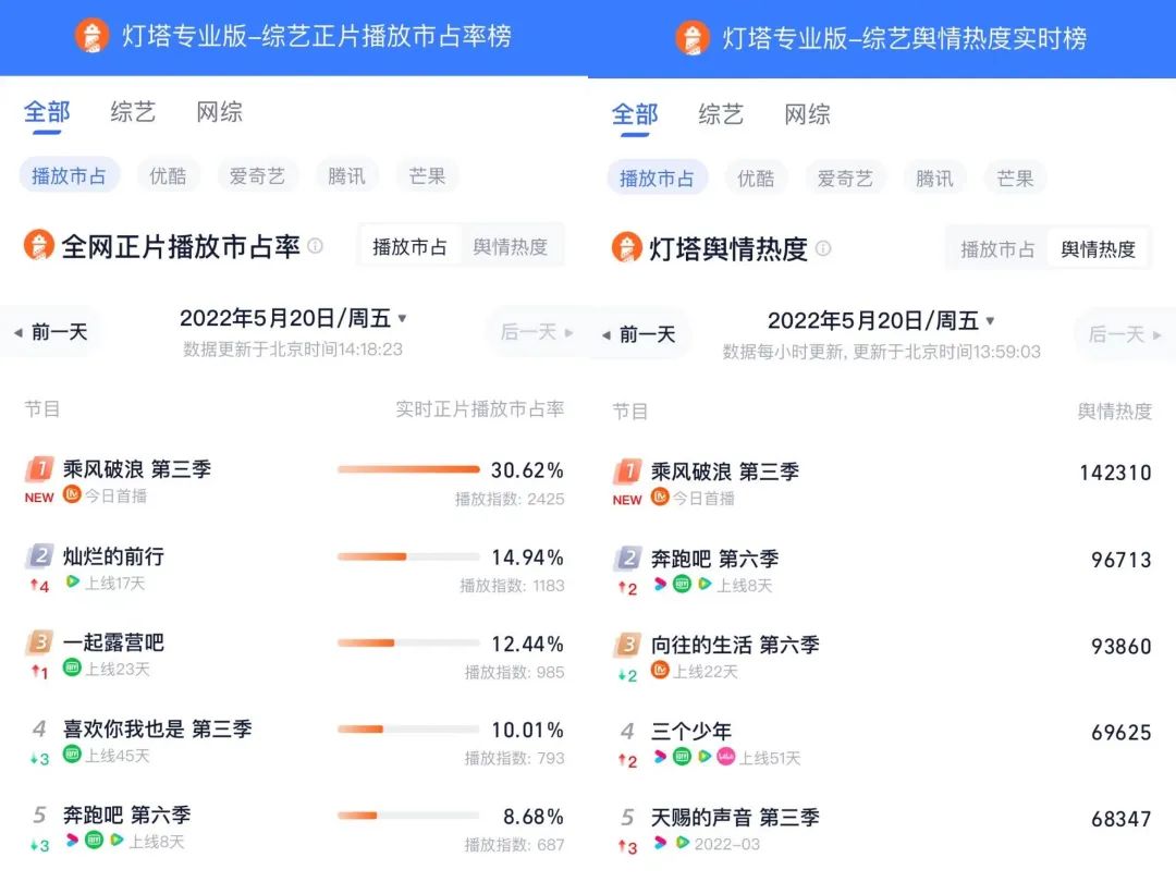 除此之外,中午节目播出后,仅是上线2小时,实时灯塔正片播放市占已迅速上升至30.62%位列第一,正片播放、热度双领跑全网综艺节目;与此同时,节目也迅速席卷了猫眼综艺热度榜等。
