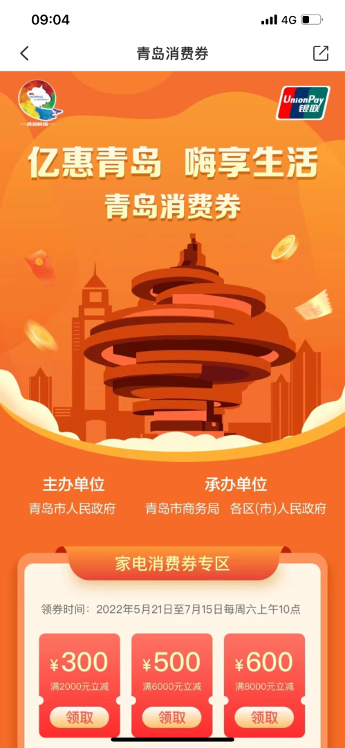 其中,家电消费券从5月21日开始发放,到7月15日结;零售和餐饮消费券从6月18日开始发放,到10月7日结束。其他消费券将结合实际情况陆续发放。市民朋友可关注“银联青岛”微信公众号或云闪付App首页“青岛市消费券”专区,及时获取发放信息,避免错过领取时间。