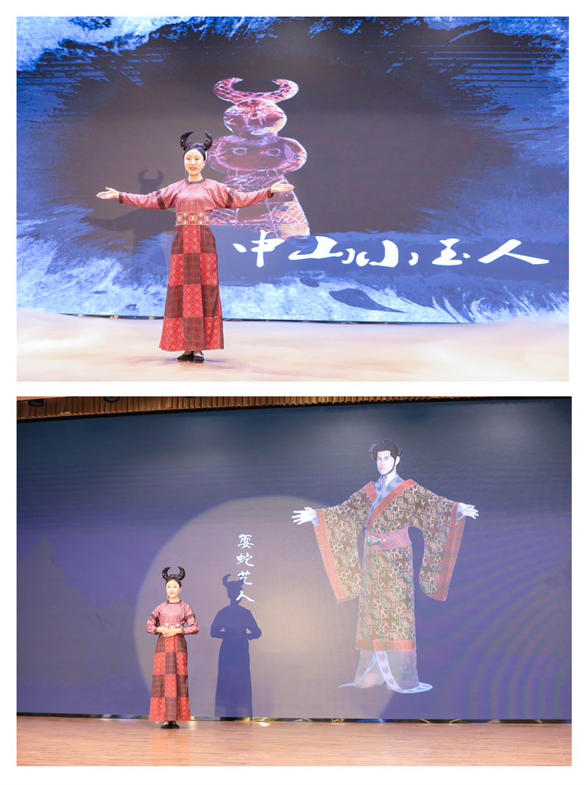 身穿复原成品服饰的中山国“小玉人”,以及利用科技手段创设的中山狩猎者、采桑女、饮酒贵族、耍蛇艺人等数字化人物形象一一出场。他们满怀深情的讲述配合出土文物高清图片展示,生动再现了这个被史书“忽略”的国度在军事、农业、文化等方面曾经的辉煌与成就。