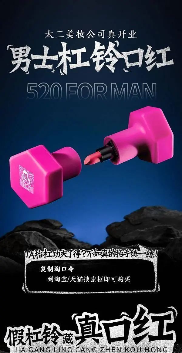 口红一向与女性挂钩,然而太二却另辟蹊径,将其打造为男性杠铃口红,还将其与品牌口味、520等关键词结合,确实妙上加妙。