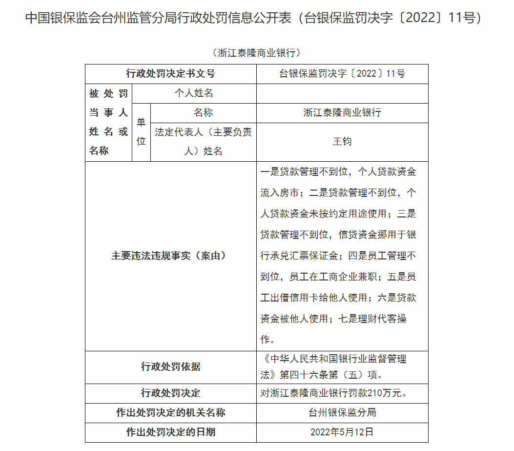 据中国银保监会台州监管分局消息,近日,台州银保监分局开出两张超大罚单,罚款金额均超百万元。其中,浙江泰隆商业银行因7项违规被罚210万元,这也是该行今年第二张超百万元的罚单。中国银保监会台州监管分局行政处罚信息公开表(台银保监罚决字〔2022〕11号)显示,浙江泰隆商业银行本次违规的具体案由为:一是贷款管理不到位,个人贷款资金流入房市;二是贷款管理不到位,个人贷款资金未按约定用途使用;三是贷款管理不到位,信贷资金挪用于银行承兑汇票保证金;四是员工管理不到位,员工在工商企业兼职;五是员工出借信用卡给他人使用;六是贷款资金被他人使用;七是理财代客操作。