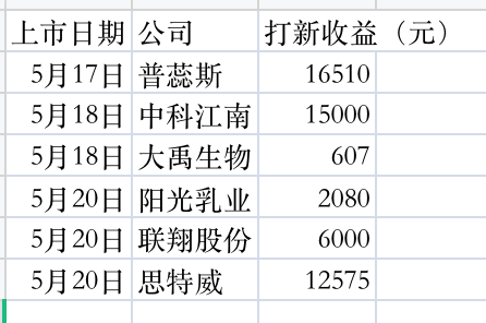 近来打新市场回暖,5月以来的打新收益均为正值。以首日最高价格来计,进入5月,共计10只新股上市,打新收益过万元的就有6只。