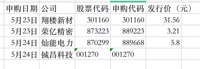 这其中,部分公司发行价出炉,荣亿精密为3.21元、翔楼新材31.56元、灿能电力5.8元,3者申购上限分别为180.02万股、5万股、96.18万股,所以顶格申购需配市值分别为1800.2万元、5万元、961.8万元。这3公司的中签号出炉时间分别为5月27日、5月25日、5月30日。还有一个细节是,荣亿精密、翔楼新材、灿能电力的发行市盈率分别为23.89倍、20.03倍、20.72倍,对应行业市盈率分别为25.33倍、22.08倍、6.95倍。很明显灿能电力的发行市盈率高出行业市盈率不少。