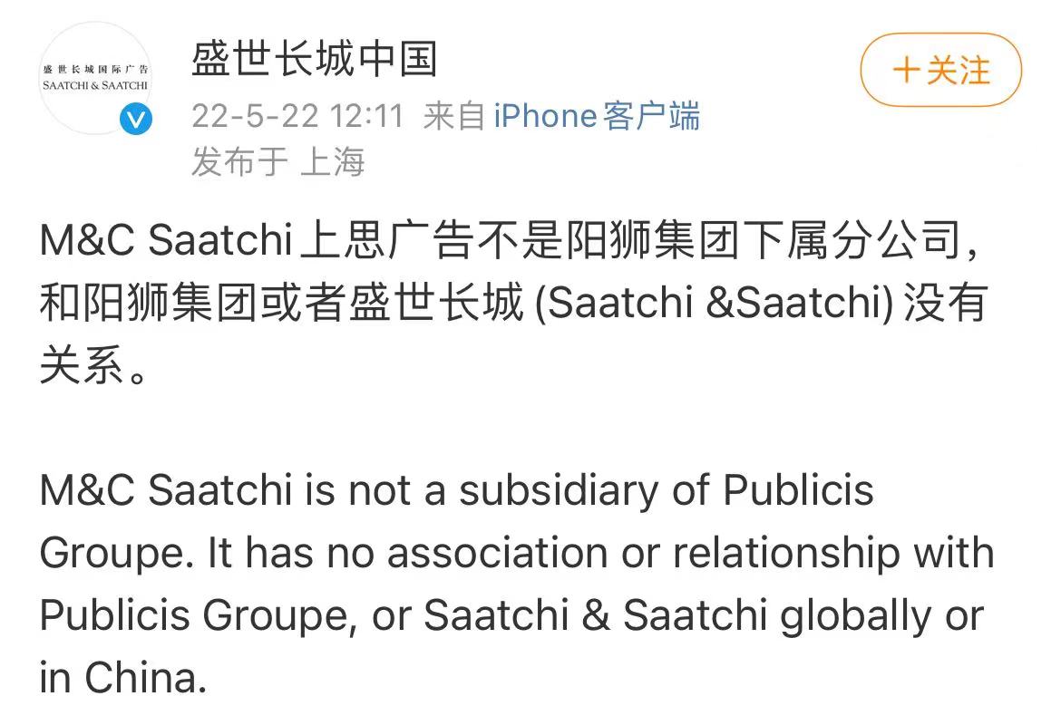 5月22日,@盛世长城中国 发文称,M&C Saatchi上思广告不是阳狮集团下属分公司,和阳狮集团或者盛世长城(Saatchi & Saatchi)没有关系。