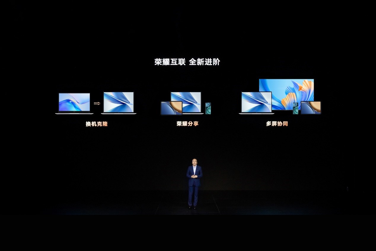 在发布会上赵明表示,未来荣耀将基于Android、Windows、Lite OS三大操作系统的标准能力,在合作伙伴的架构和体系基础上,通过荣耀的软硬协同能力,更好地释放软硬件的潜能,并打通硬件、系统、生态间的壁垒。这标志着,荣耀将跳脱出“1+X+N”的模式,即“1”不再是手机,而是根据人当前使用的设备来进行切换和流转,当你使用手机的时候,手机成为个人设备所使用的“1”,所有的服务和体系,都会向手机来进行聚集,当你以笔记本和平板为中心的时候,平板和笔记本就成为这个体系的中心。