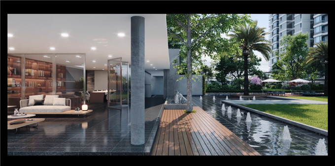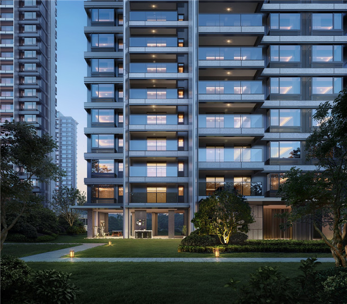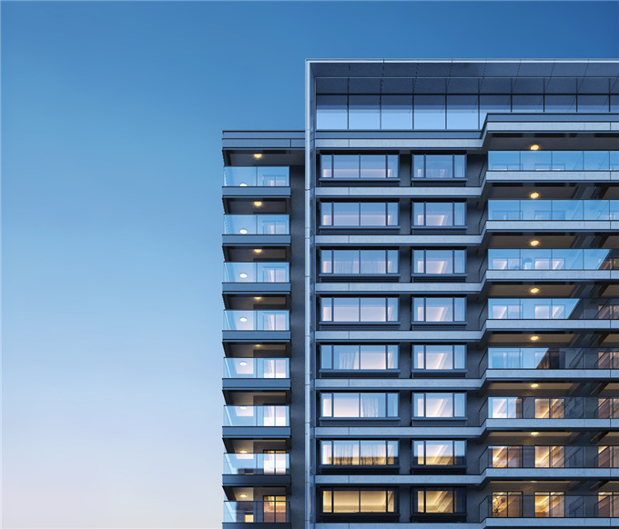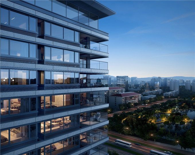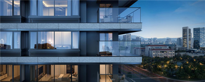 极富辨识度的公建化建筑外立面,同步SUPER—FLAT超扁平极简美学,奢华铝板+水晶灰双层中空玻璃+优雅几何线条组合,高级感满格。众多周知,此种材质的外立面多见于豪宅。例如售价30万+元/平方米的汤臣一品,外立面即是铝板与大面积玻璃组合。