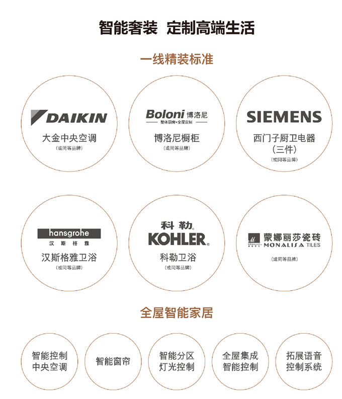 未来居住中交|象江来,是生活品质的代表,更是身份标签的象征。高配同步一线奢装品牌,全系配备大金中央空调(或同等品牌),誉为空气研究专家,更是知名的奢侈品牌。高级定制意大利名师设计的博洛尼橱柜(或同等品牌)。卫浴系统选用汉斯格雅(或同等品牌)龙头,深圳湾1号、苏州桃花源亦同此配置。配置西门子或同等档次的厨电三件套,油烟机、炉灶、消毒柜,享受源自德国百年精工品牌。更震撼的是,投入更高成本,配置连纹蒙娜丽莎岩板,美感与实用兼备。