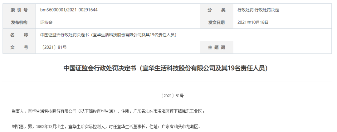 2021年10月18日,证监会就宜华生活信息披露违法违规行为下发了处罚结果,其中宜华生活被处以600万元罚款,公司实际控制人刘绍喜除被罚款930万元外,并终身禁入证券市场。