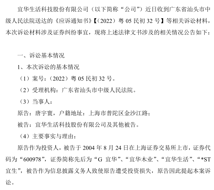 而这已经不是宜华生活近期首次被投资者起诉事件。两个月前,一位名为唐宇寰的投资者也将其告上法庭,要求宜华生活及其他被告共同赔偿投资差额损失、投资差额损失部分手续费、投资差额损失部分过户费合计665.55万元。