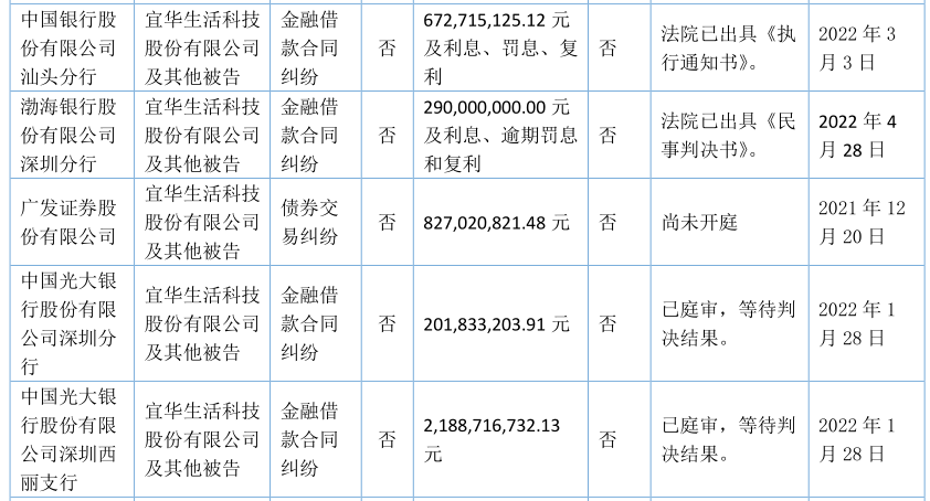 截至2022年4月29日,对于中国银行、渤海银行两宗案件,法院已经出具《执行通知书》或《民事判决书》,宜华生活需支付9.63亿元及及利息、罚息(逾期罚息)、复利;而另外两宗案件目前也已经庭审结束,正等待法院判决结果。