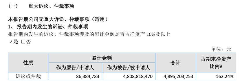 据2021年年报介绍,报告期内,宜华生活作为被告人/被申请人的累计诉讼、仲裁事项涉及金额达48.09亿元,占期末净资产比例为159.4%。
