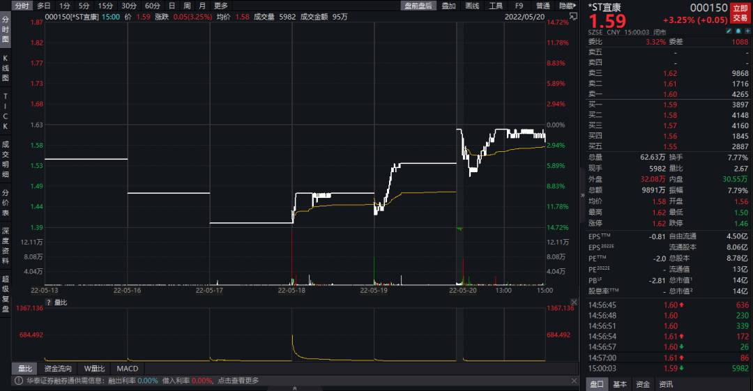 但在高溢价并购了众多公司后,由于经营难以为继,实体业务不能支持市场期望以及投资者热情的冷却,公司股价随着企业近几年的亏损不断下滑。截至2022年5月20日收盘,*ST宜康的股价仅为1.59元/股。
