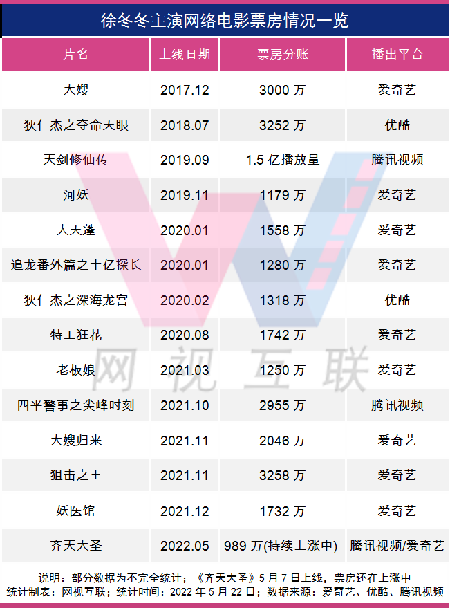 据网视互联统计,2017年-2021年,徐冬冬主演的电影连续5年登上网络电影年度票房排行榜。