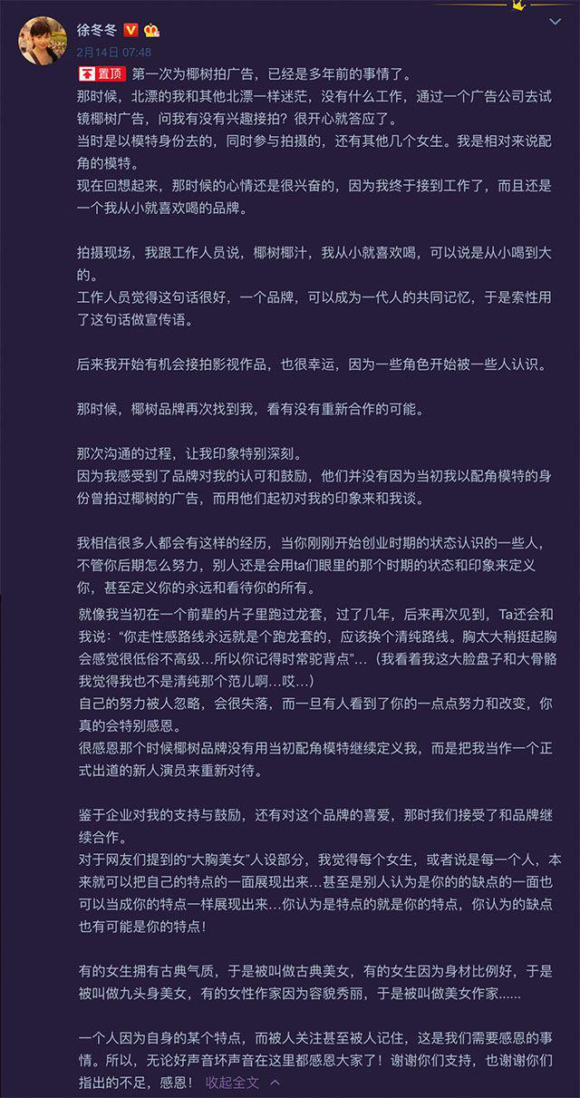 2019年,因为“从小喝到大”的广告语成为了全民关注的热点。一时间,徐冬冬代言的椰树牌椰汁登上了舆论的风口浪尖,备受质疑。按照业内惯例,此时代言人应该立刻宣布解约或者撇清关系,但作为代言人的徐冬冬却并没有这样做,而是第一时间挺身而出发长文维护代言品牌,呈现出了难得的包容、仗义和担当,也因为徐冬冬随口说的一句“从小喝到大”最终成为椰树椰汁的经典广告语,从而使得双方合作多年,情谊深深,从这里也可以看出,徐冬冬不但是一个很好的演员,还是一个很有思维和深度的广告人。