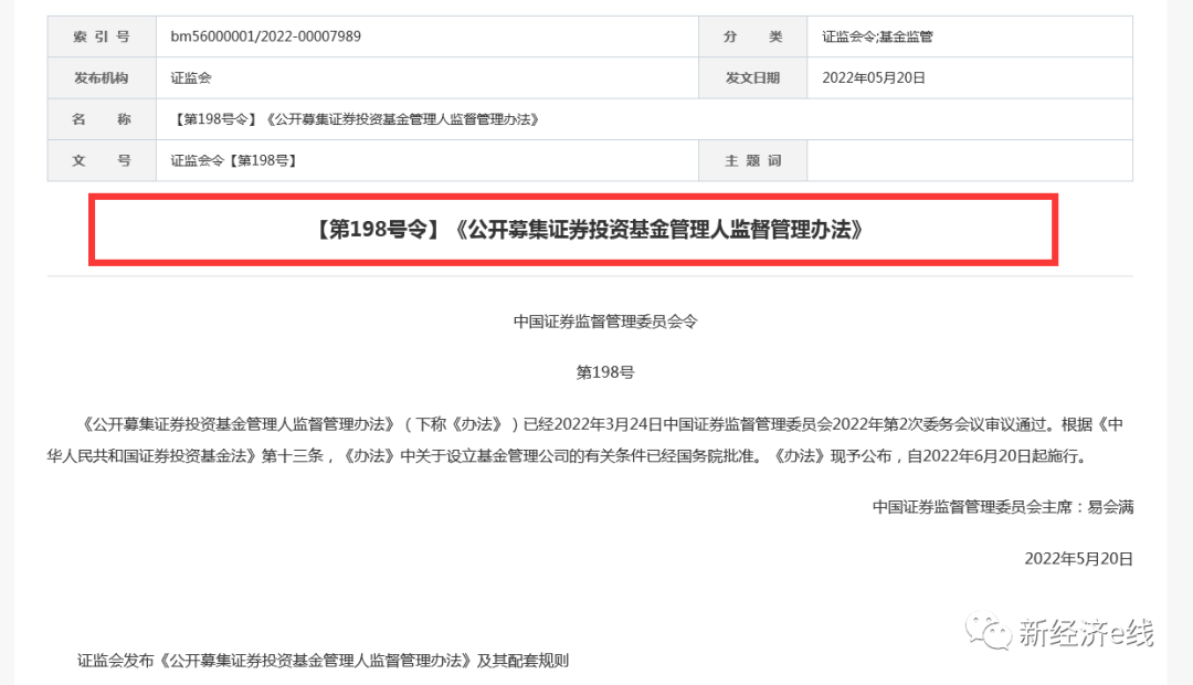 5月20日,据证监会官网披露,为加快推进公募基金行业高质量发展,进一步提高公募基金行业服务资本市场改革发展、服务居民财富管理、服务实体经济与国家战略的能力,推动构建多元开放、竞争充分、优胜劣汰、进退有序的行业生态,切实保护基金份额持有人合法权益,证监会修订了《证券投资基金管理公司管理办法》,并更名为《公开募集证券投资基金管理人监督管理办法》(以下简称《管理人办法》)。近日,证监会正式发布《管理人办法》及其配套规则,自2022年6月20日起施行。