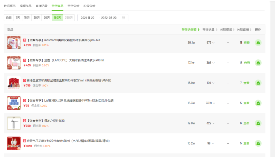 在直播带货的美妆商品中,不乏雅诗兰黛、兰蔻、兰芝、Whoo后、SK-II等知名美妆品牌,带货销售额最高也只达83.8w。从数据来看,转化效果并不是十分理想。