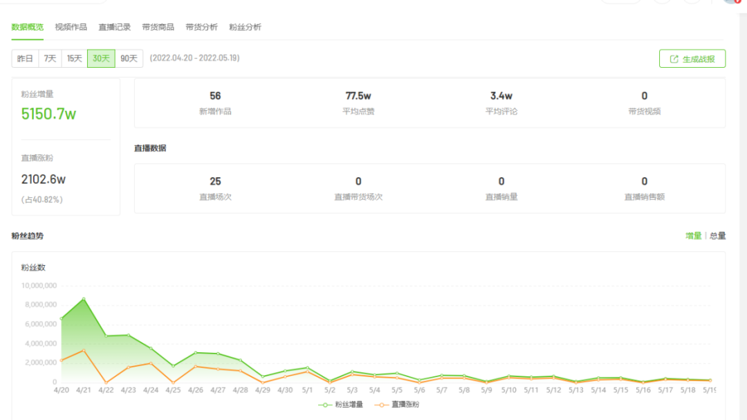 根据飞瓜数据统计,近一个月内,刘畊宏直播的累计在线观看人数超过1亿,4月21日单场直播在线观看人数达到5257万,创下了抖音平台今年的最高纪录。