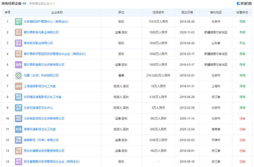 天眼查显示,刘涛关联14家公司,其中9家为存续状态,包括北京锦阳资产管理中心(有限合伙)、霍尔果斯涛阁文化传媒有限公司、花圃(北京)科技有限公司等,版图涉及投资、影视、科技等多个领域,注册资本多在百万乃至千万级别。