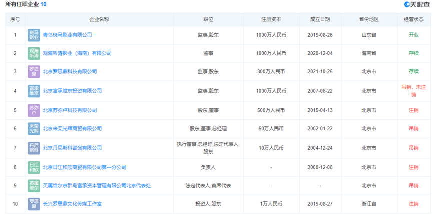 天眼查显示,王珂共关联10家公司,其中3家为存续状态,包括青岛斑马影业有限公司、观海听涛影业(海南)有限公司、北京罗思鼎科技有限公司。