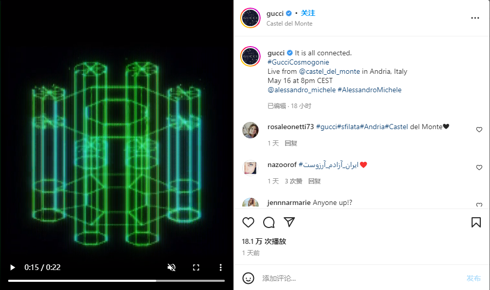 5月17日,开云集团旗下的意大利奢侈品牌Gucci(古驰)举办以“古驰创星说”(Gucci Cosmogonie)为主题的 2023早春系列时装秀,选址非常特别:位于意大利南部普利亚(Puglia)地区的中世纪古堡 —— 蒙特城堡(Castel del Monte)。这是 Gucci “与历史遗迹对话”系列的又一个重要篇章。