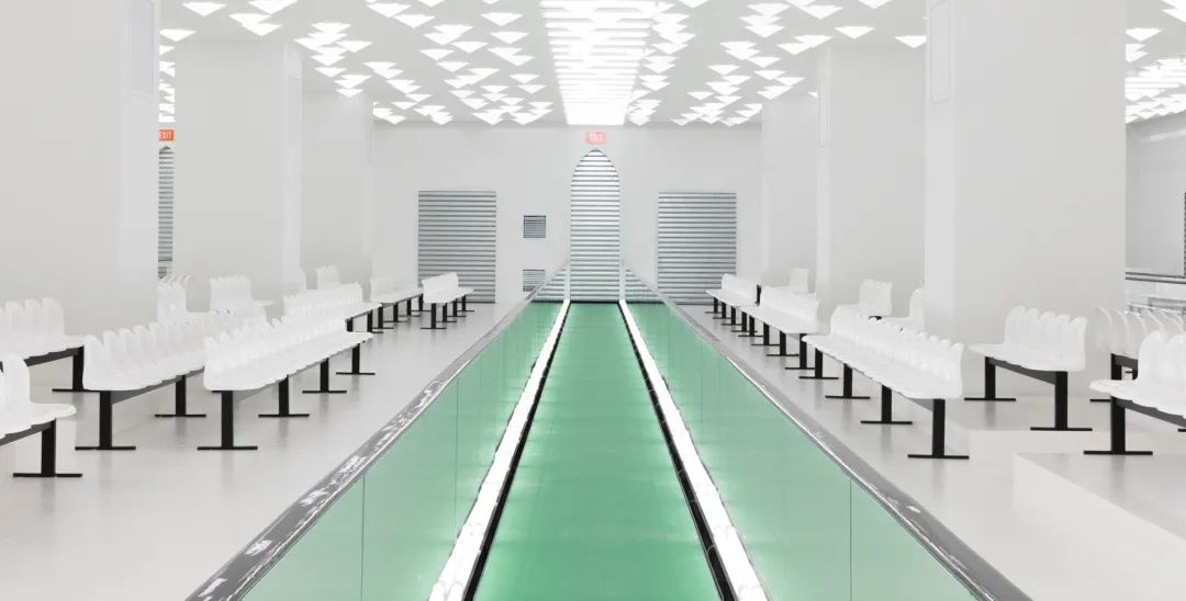 2020春夏时装秀秀场被布置成一个冰冷洁净,病态诡异的工厂,天花板闪烁着奇异的灯光,白色塑胶椅前是一条通往金属卷帘门的传送带。Alessandro Michele 借此阐述了“微观权力”的概念——我们每个人的日常生活,其实都是透过一种微妙的社会制约来掌控,一系列规范和秩序,最终创造出一个被驯化的社会。这一季时装大规模回归1970—90年代修长、贴身、性感的女性轮廓,表达90后强势的性感与挑衅叛逆的态度。