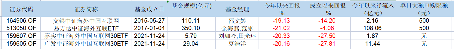 今年以来,投资者对互联网板块“越跌越买”,资金抄底互联网板块趋势不改,多只跟踪中证海外中国互联网指数的ETF规模持续增长。