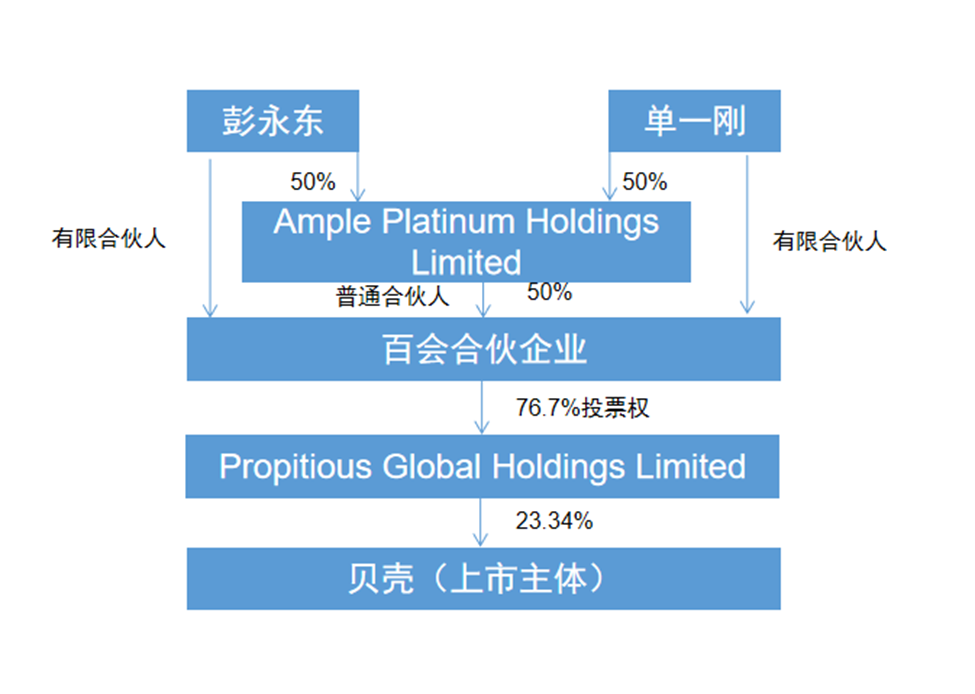 我们来一个个解读,目前,贝壳大股东为Propitious Global Holdings Limited,控制这家公司的是百会合伙企业,百会合伙企业的普通合伙人为Ample Platinum Holdings Limited,而这家公司由彭永东、单一刚各持50%的股份。