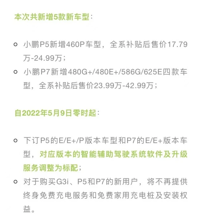 早在今年5 月 6日,小鹏汽车发布了一则通知,针对购买 G3i、P5 和 P7的新用户,将不再提供终身免费充电服务和免费家用充电桩及安装权益。取而代之的是可以享受智能辅助系统软件及升级「0 元购」。